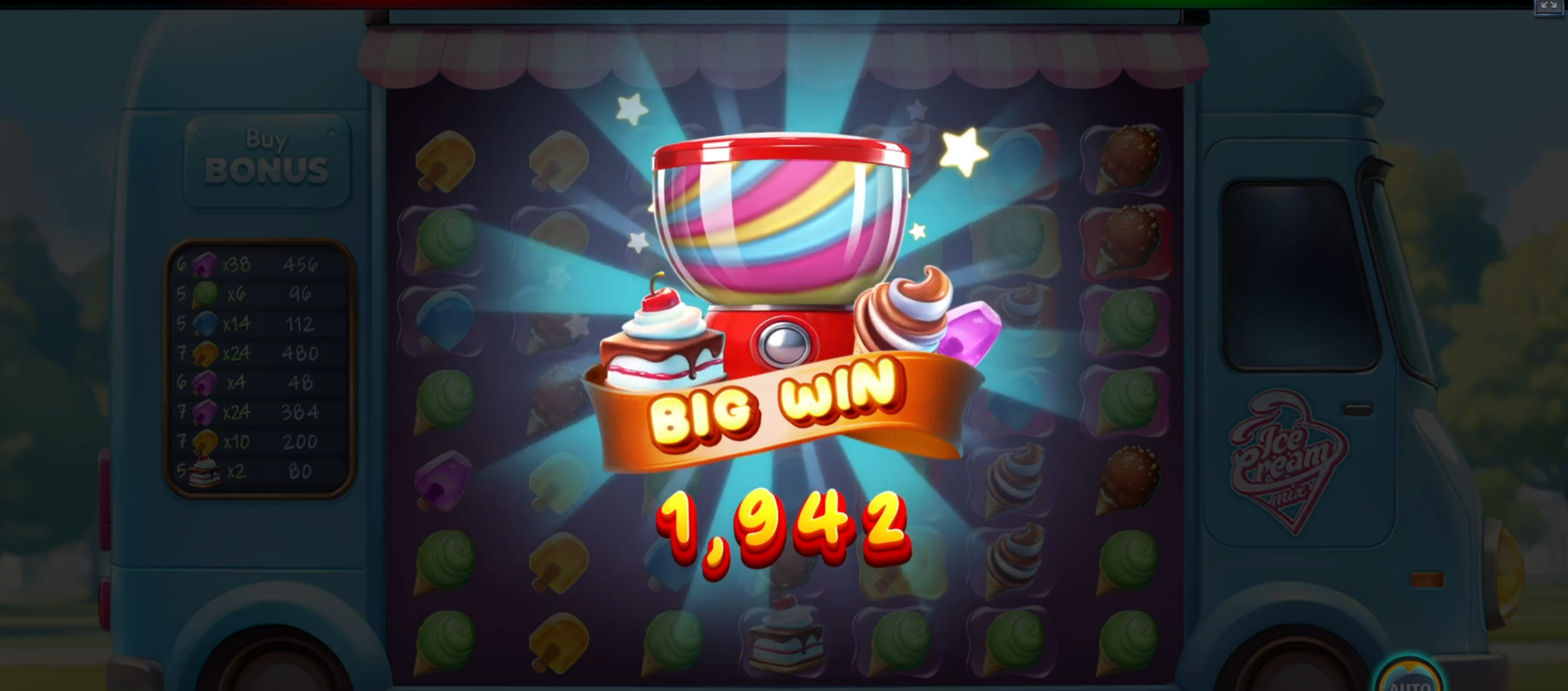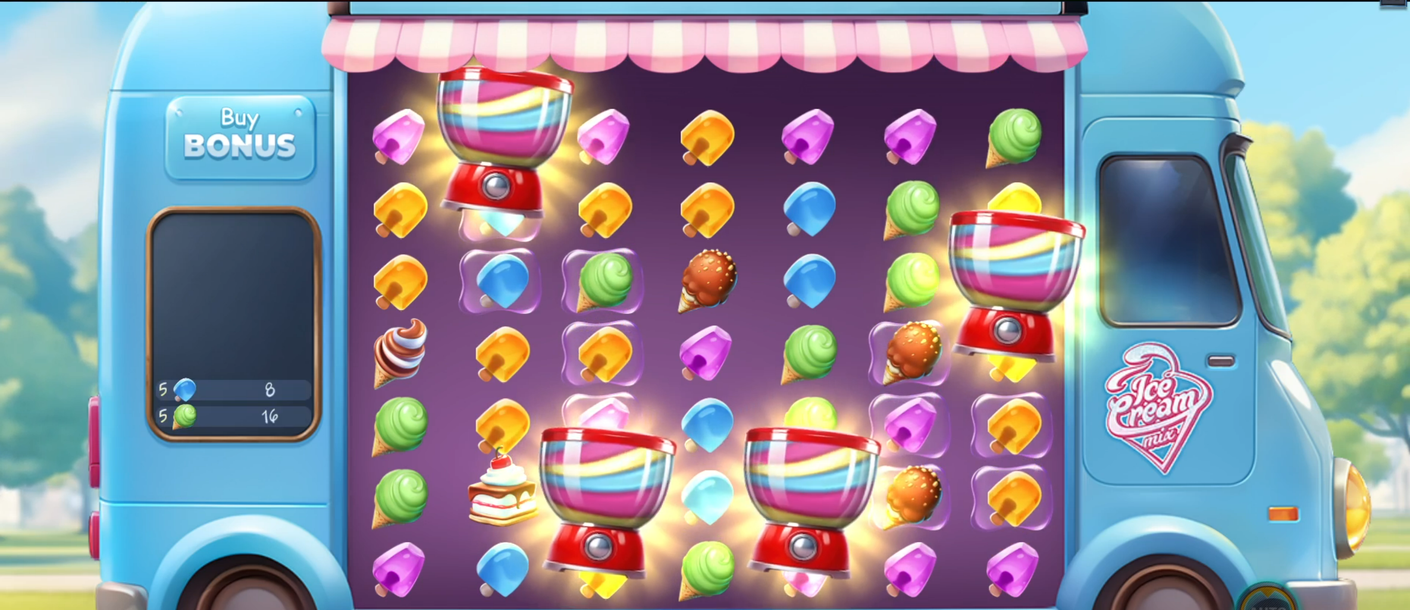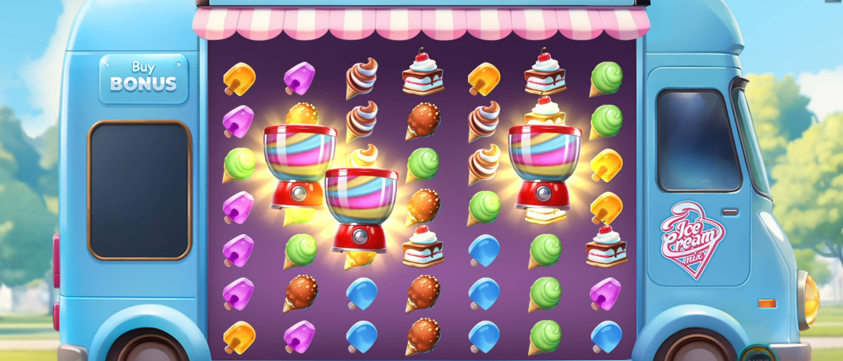 The scatter symbols of Ice Cream Mix come in the form of a candy machine. You will need to land three or more scatters at the same time, anywhere on the reels (you don’t have to think about paylines in this game) to trigger the free spins bonus round.
