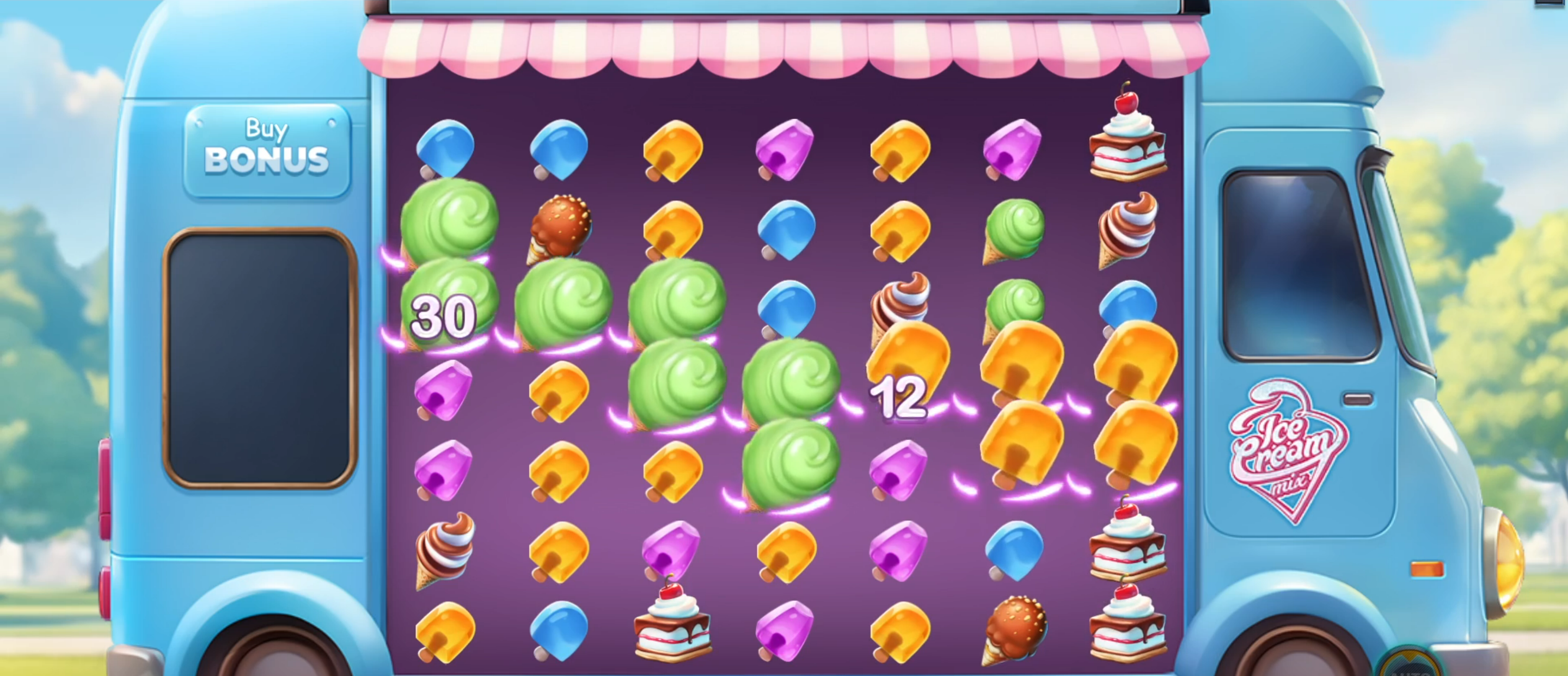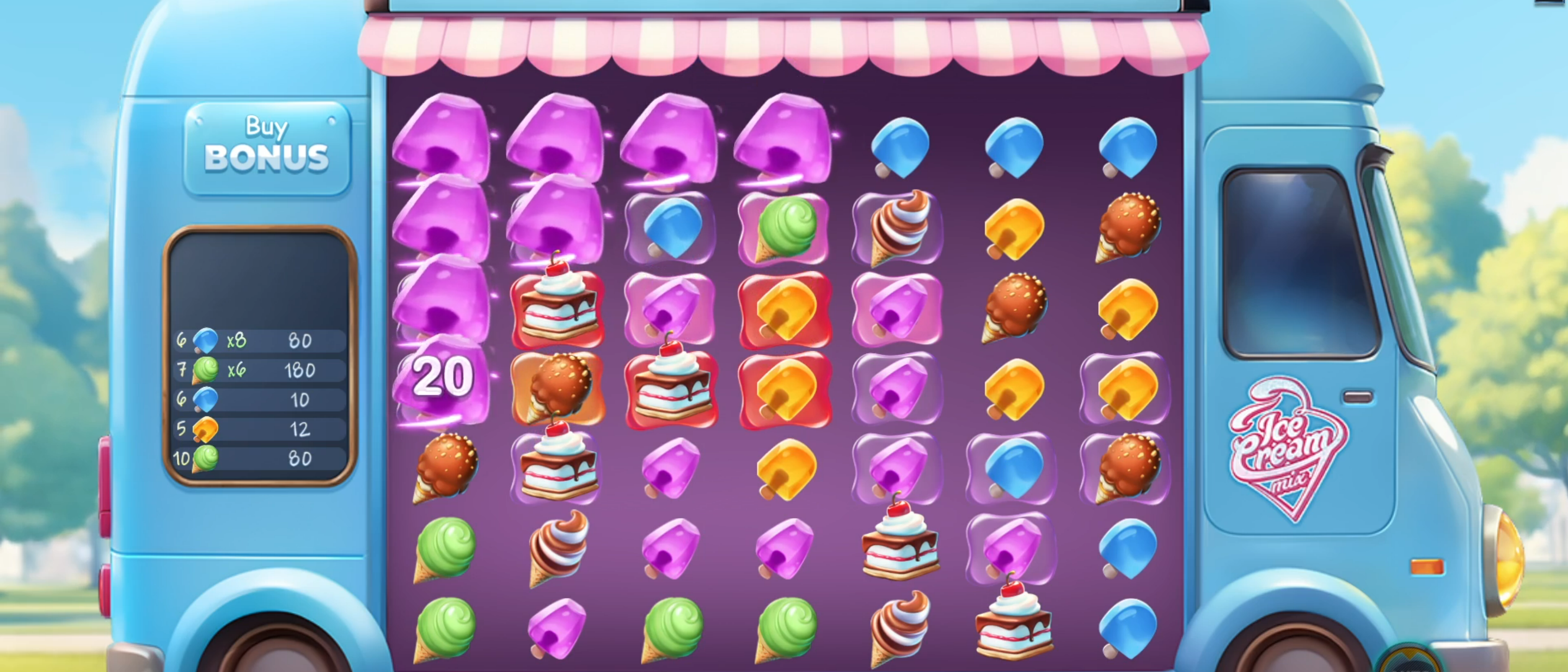In Champion’s new slot game - Ice Cream Mix - a win is formed when 5 or more matching symbols are connected vertically or horizontally.
