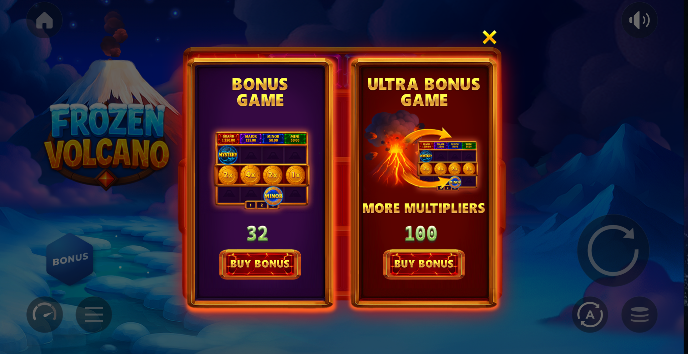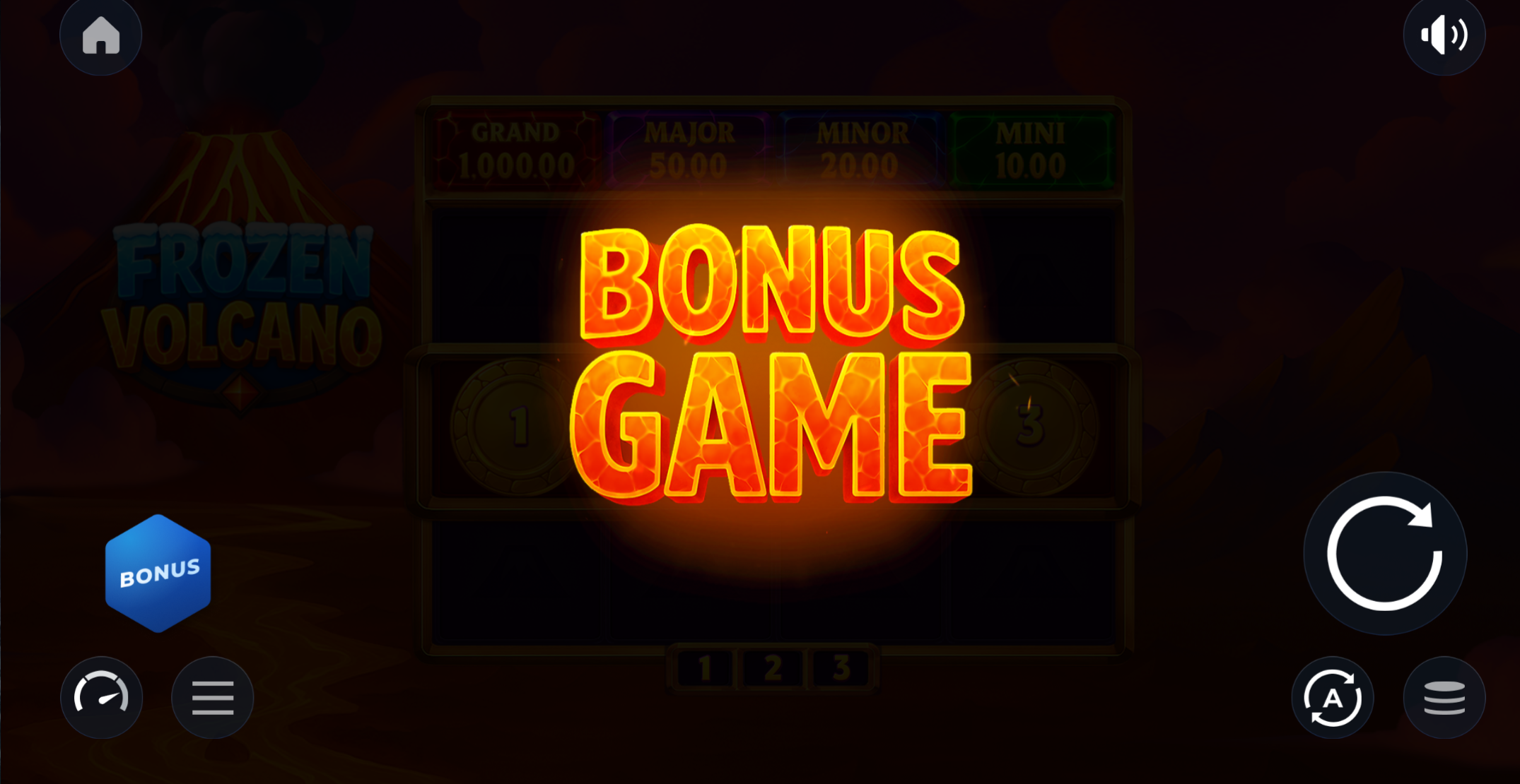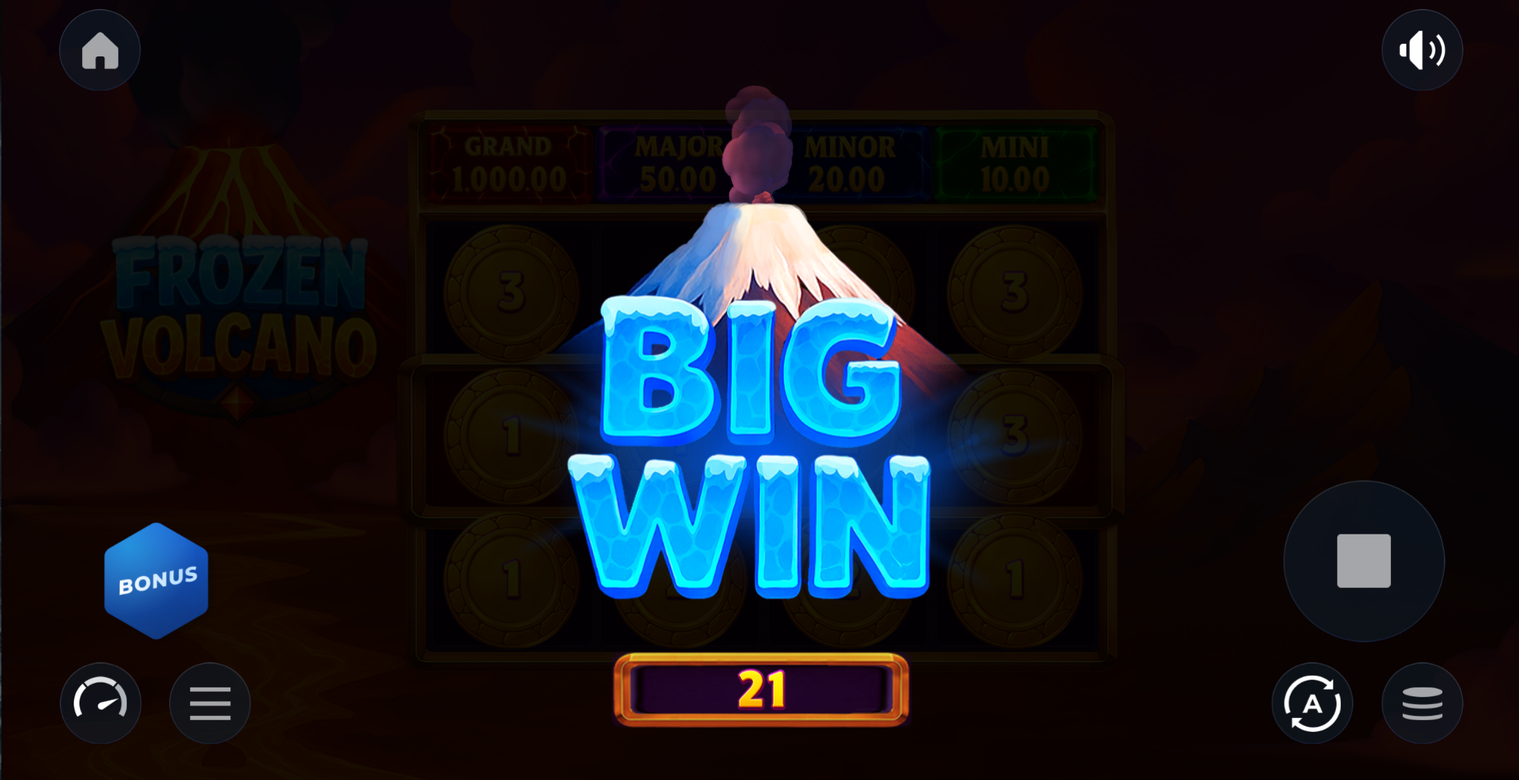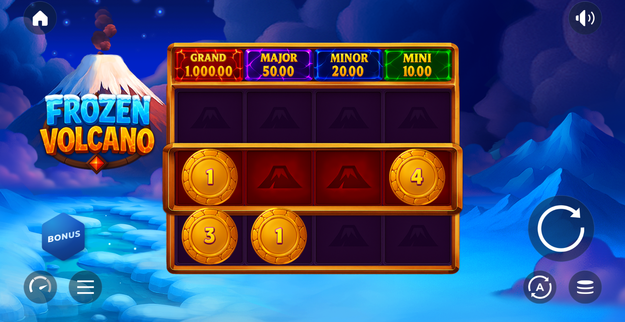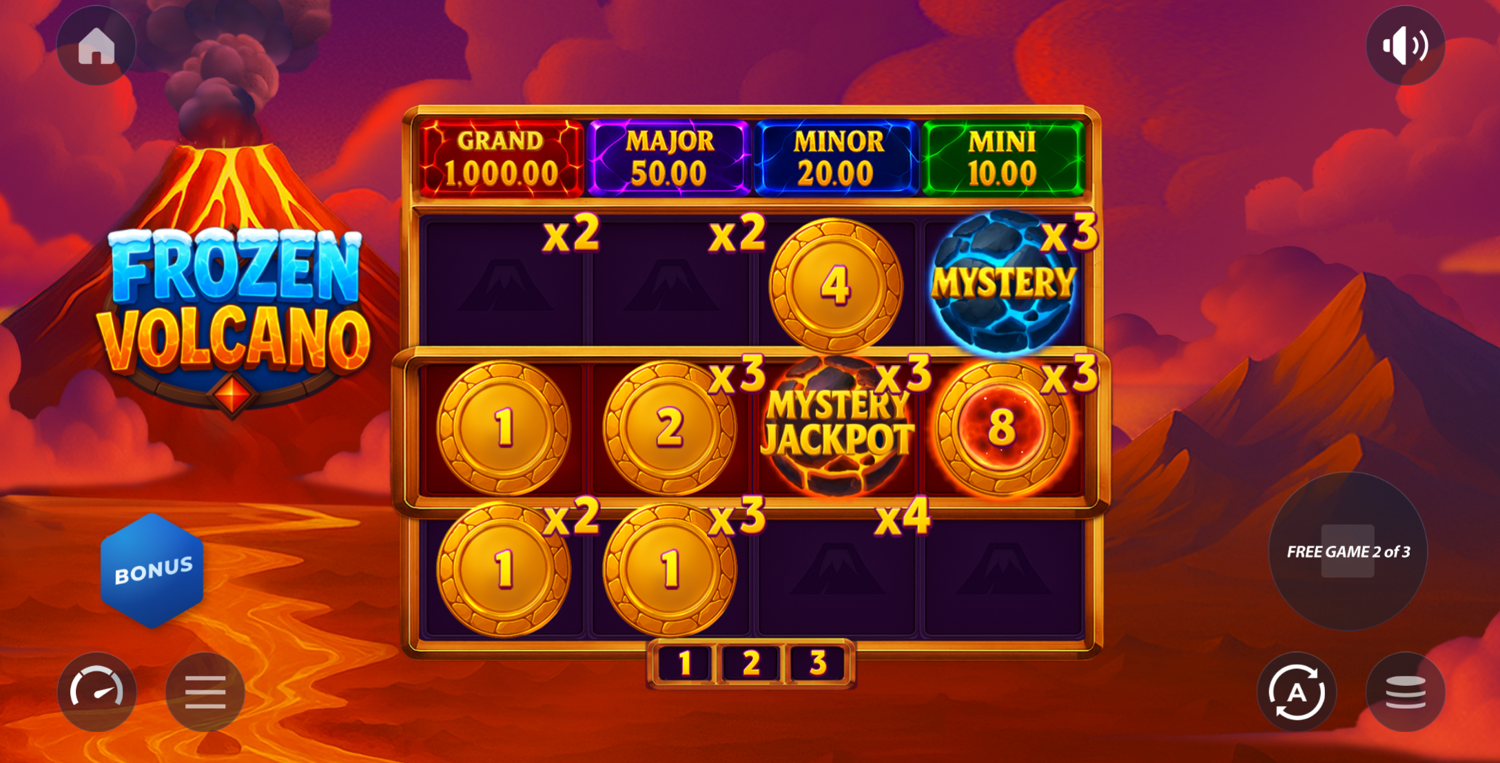 Frozen Volcano incluye tres jackpots fijos que pueden aparecer durante el juego de bonificación: Mini Jackpot, Minor Jackpot y Major Jackpot.