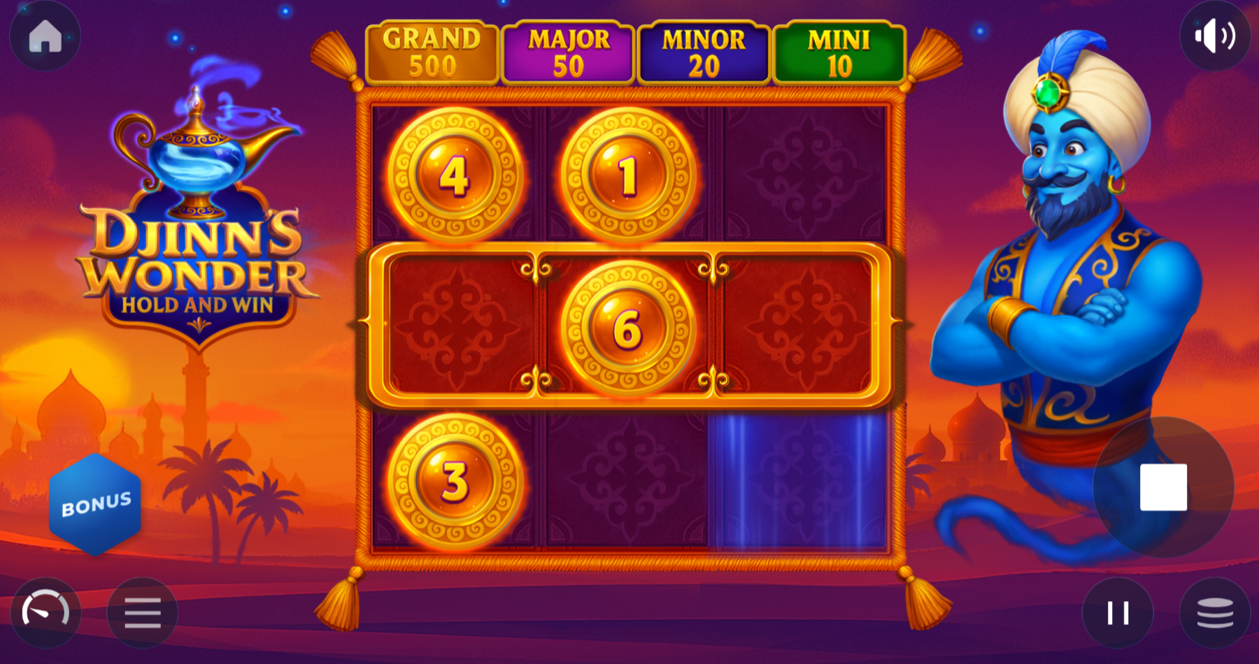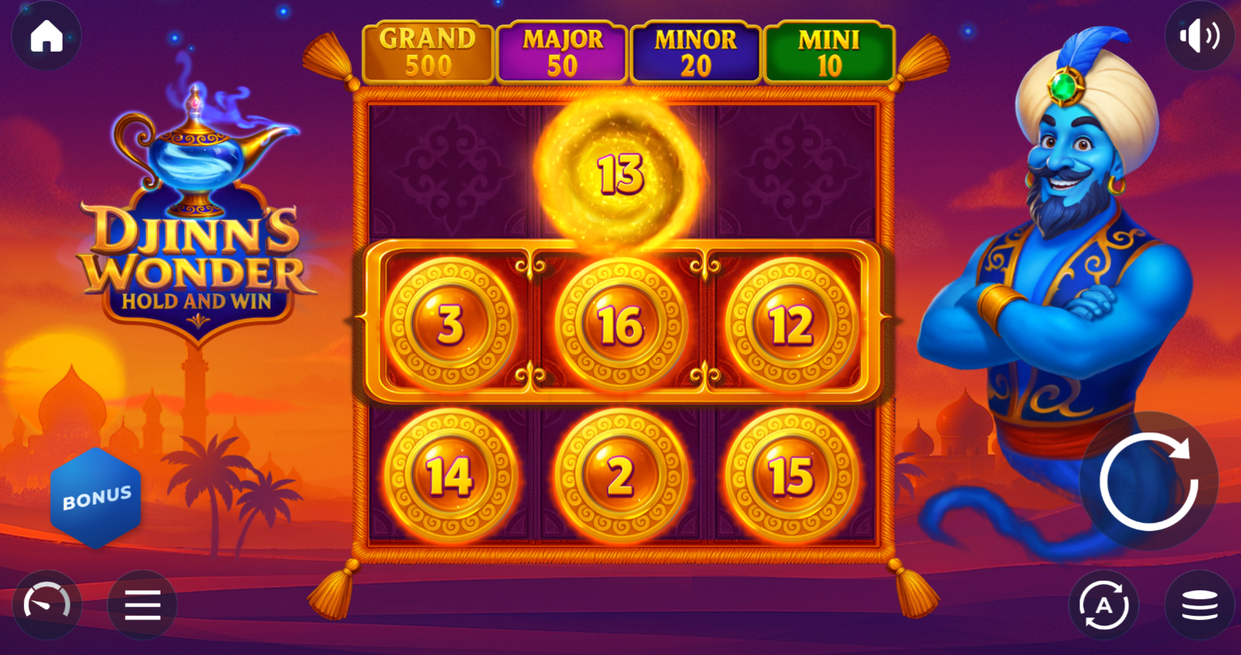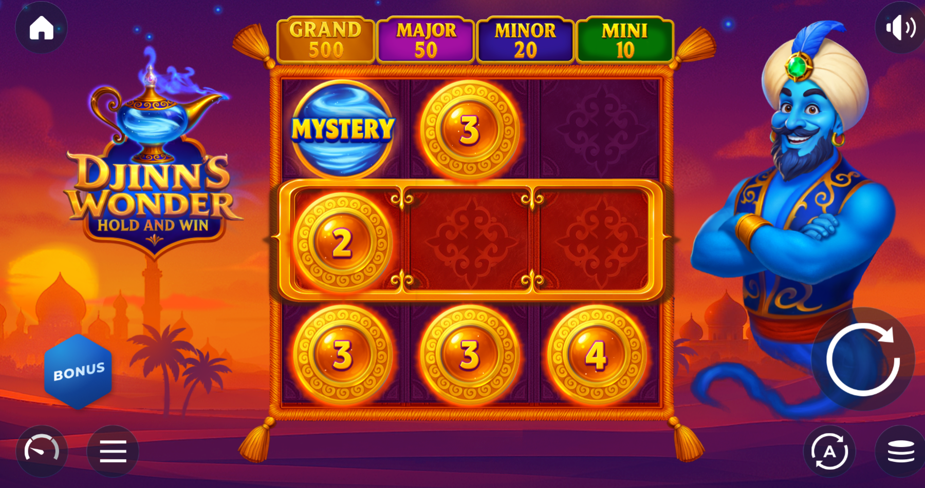 The Hold & Win Bonus Game is the core of Djinn’s Wonder. All bonus symbols stay locked on the reels during the feature. The bonus starts with 3 respins, but every new bonus symbol that lands resets the respins back to 3.